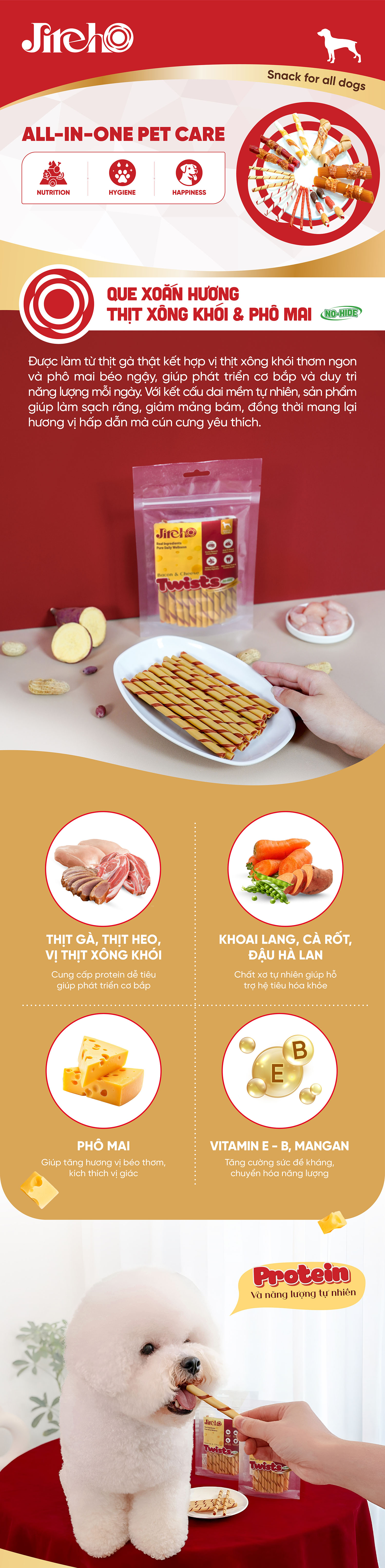 Que xoắn hương Thịt xông khói & Phô mai được làm từ thịt gà thật kết hợp vị thịt xông khói thơm ngon và phô mai béo ngậy, giúp phát triển cơ bắp và duy trì năng lượng mỗi ngày. Với kết cấu dai mềm tự nhiên, sản phẩm giúp làm sạch răng, giảm mảng bám, đồng thời mang lại hương vị hấp dẫn mà cún cưng yêu thích.