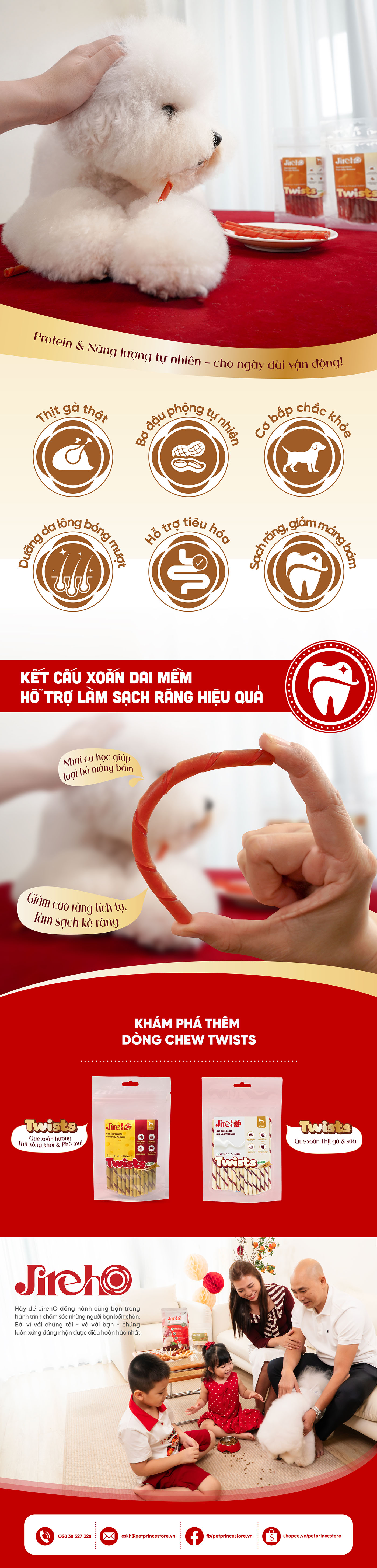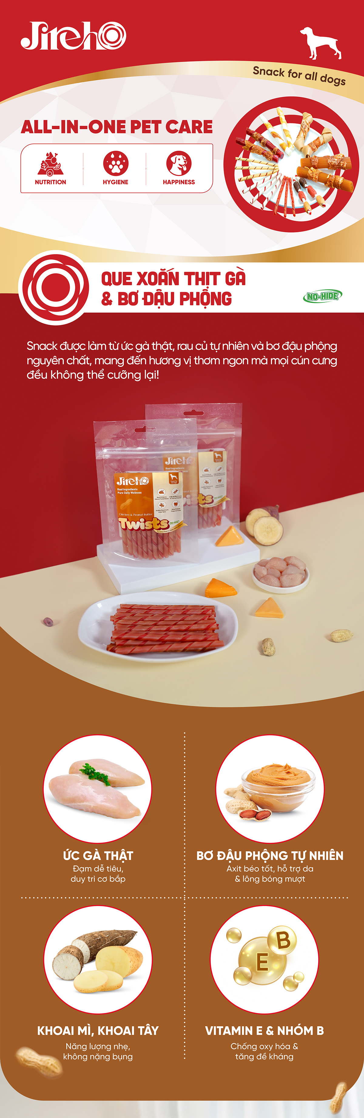 Que xoắn Thịt gà & Bơ cho chó JirehO đậu phộng được làm từ ức gà thật, rau củ tự nhiên và bơ đậu phộng nguyên chất, mang đến hương vị thơm ngon mà mọi cún cưng đều không thể cưỡng lại!