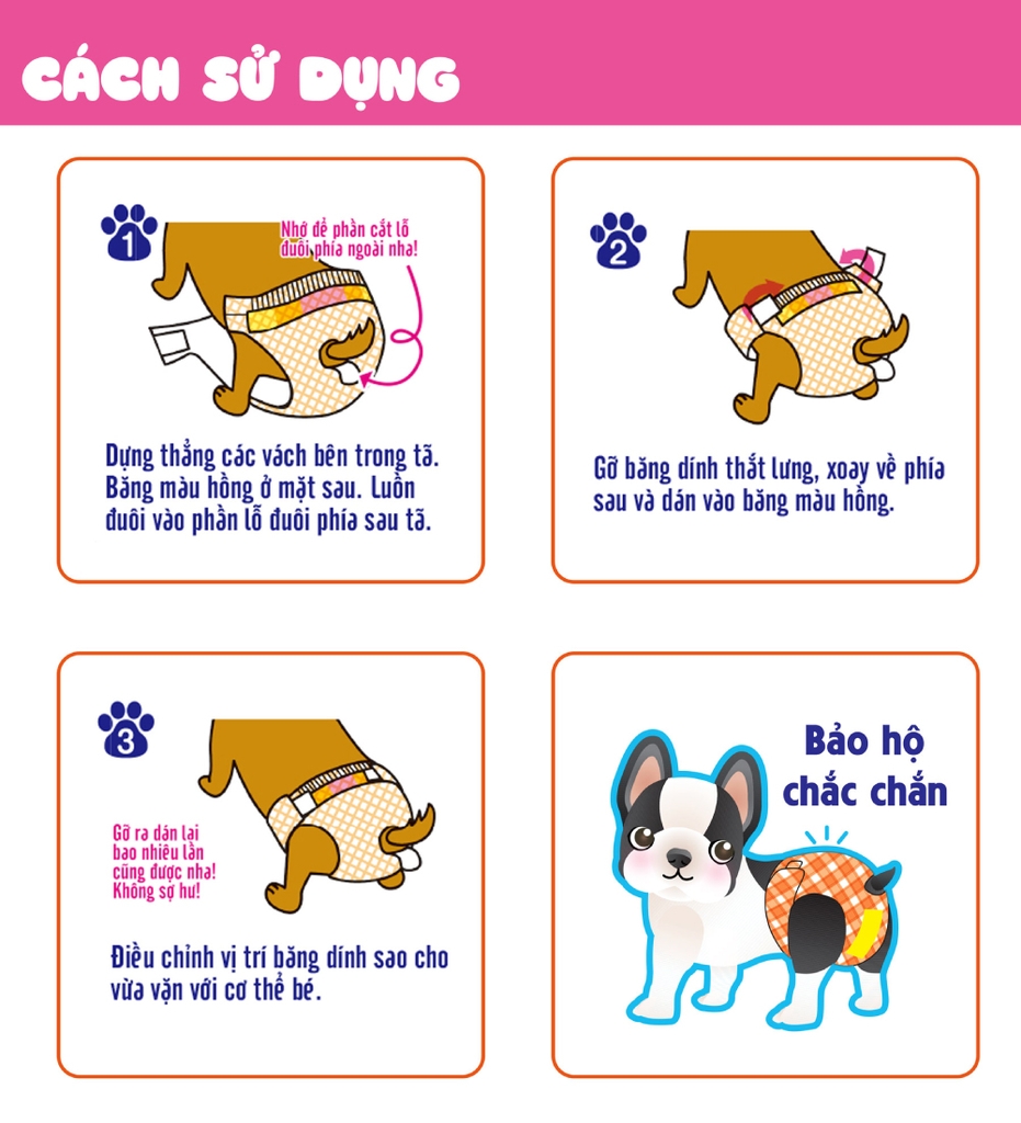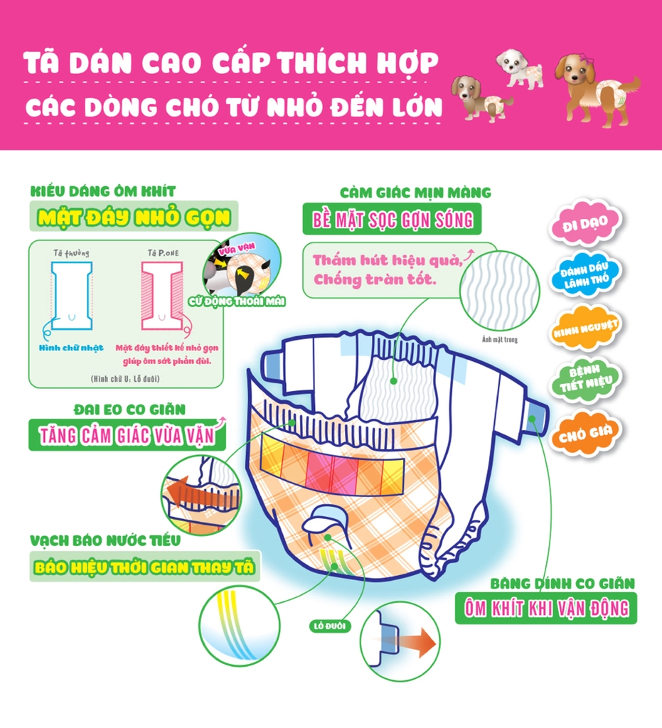 Được thiết kế đặc biệt cho chó cái trong kỳ “kinh nguyệt” hoặc khi đi ra ngoài, giúp cún luôn khô thoáng lên đến 12 giờ.