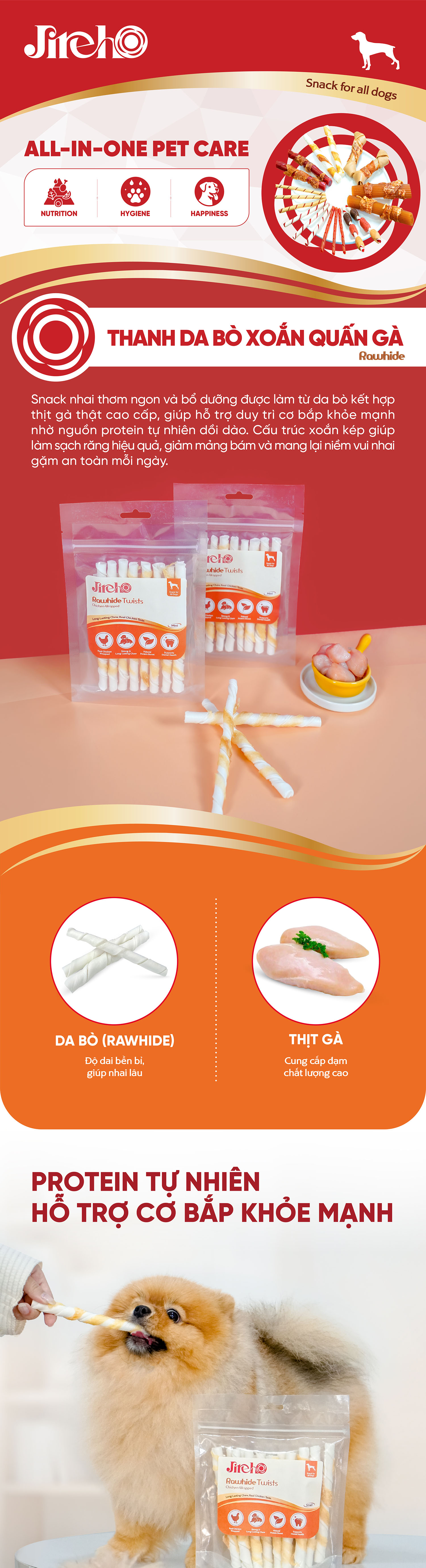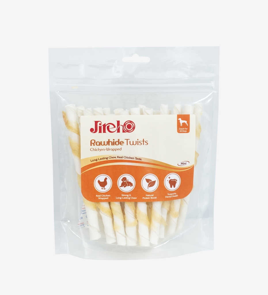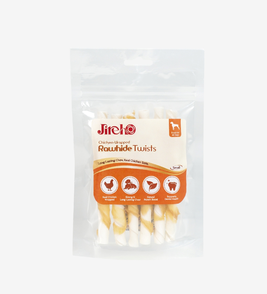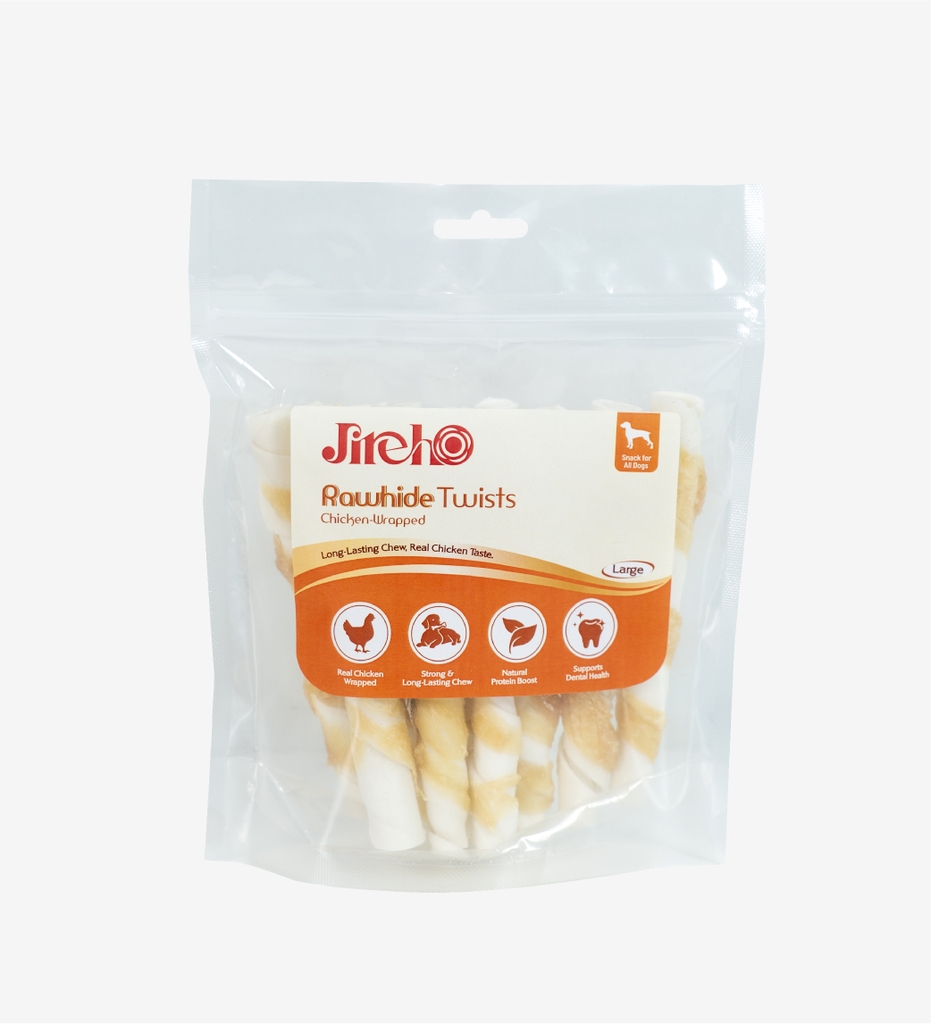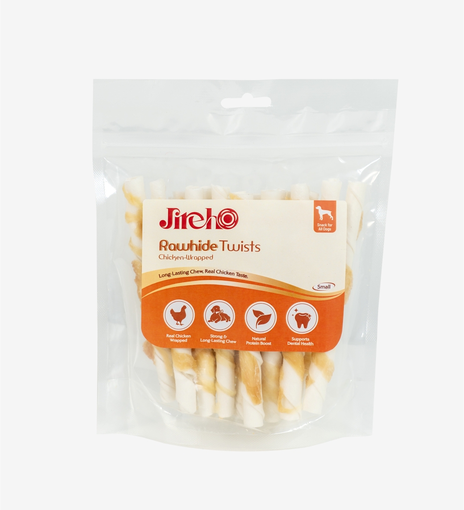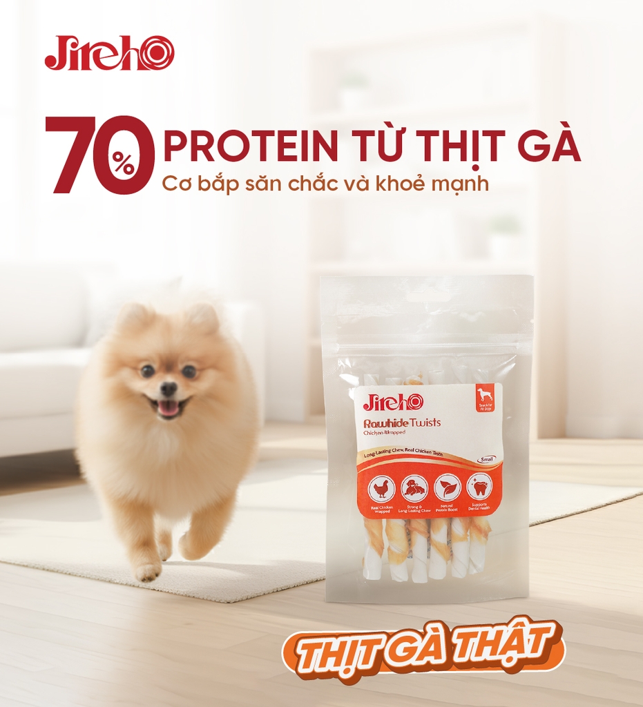 Thanh da bò xoắn quấn gà JirehO cho chó là món snack thơm ngon và bổ dưỡng được làm từ da bò kết hợp thịt gà thật cao cấp, giúp hỗ trợ duy trì cơ bắp khỏe mạnh nhờ nguồn protein tự nhiên và dồi dào.