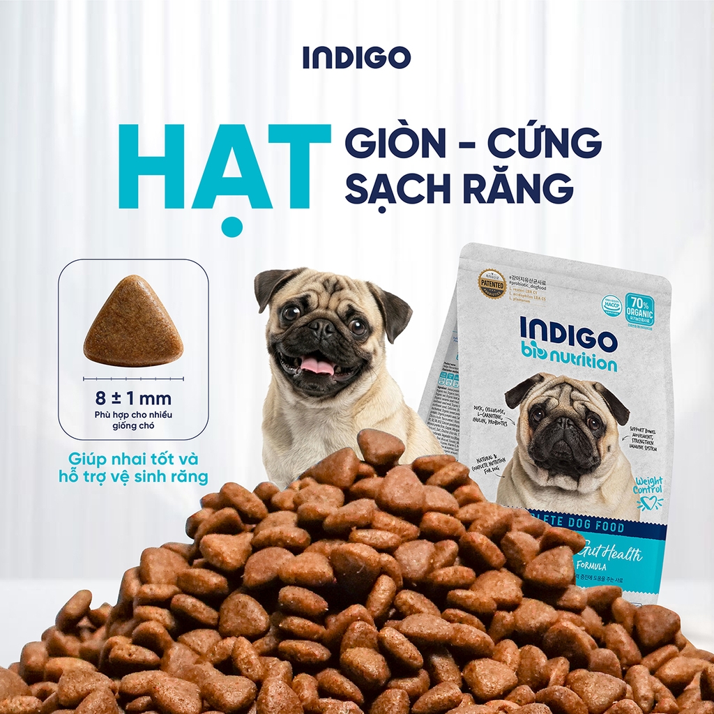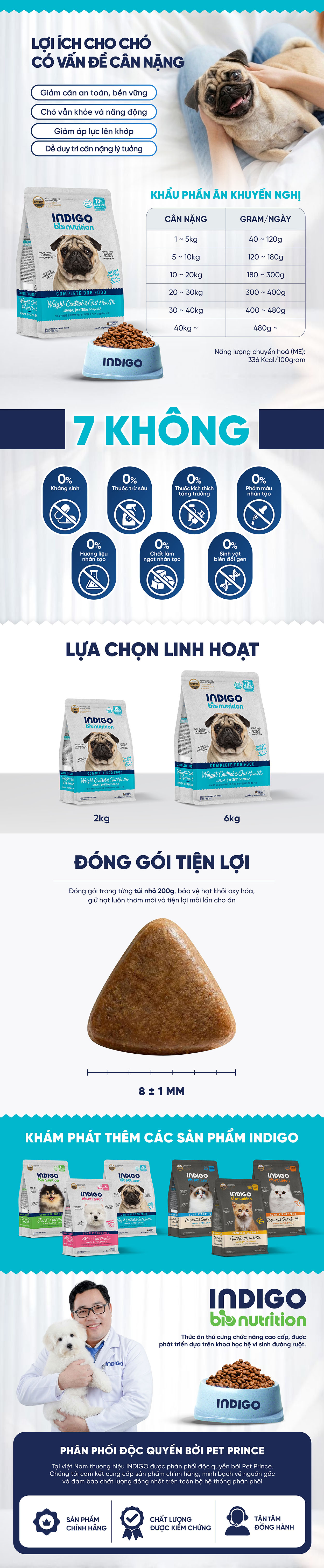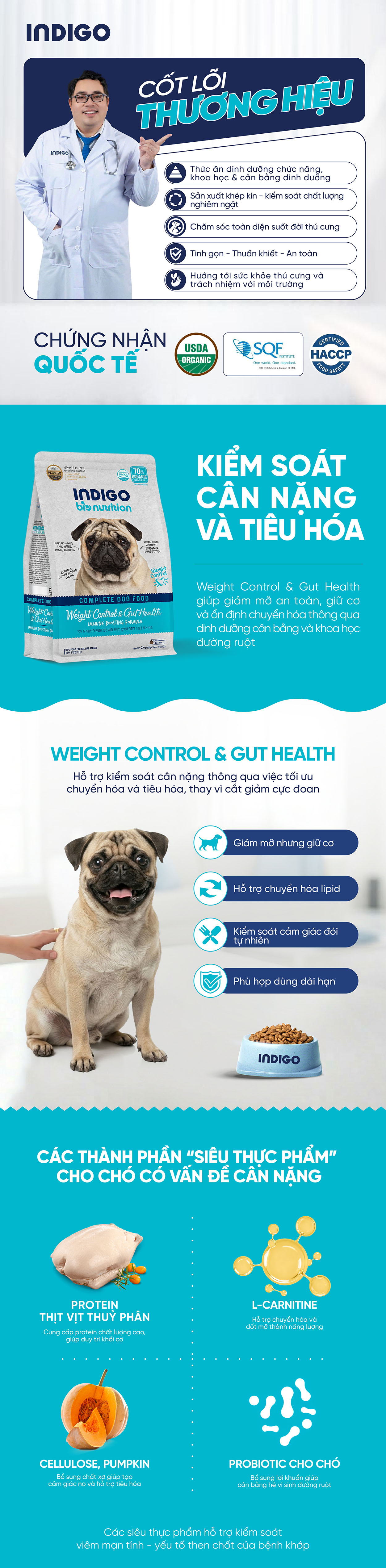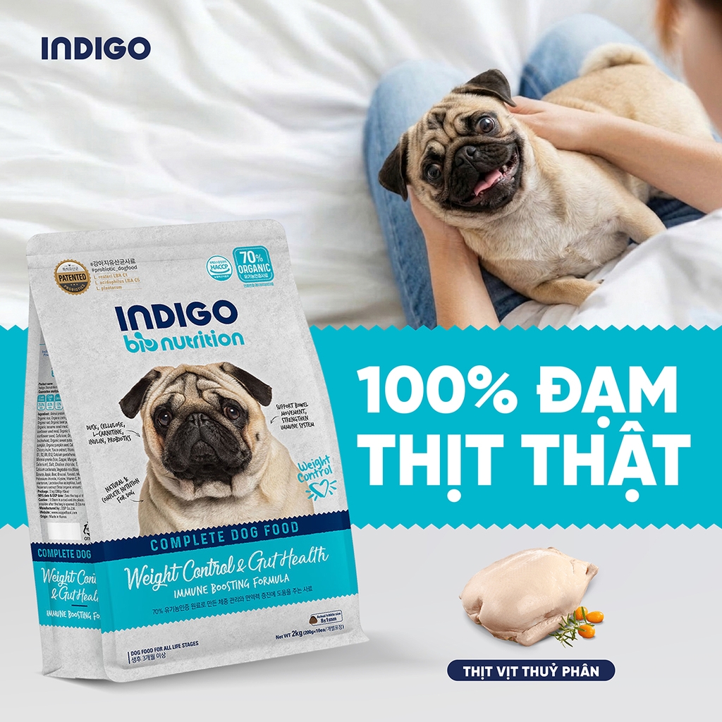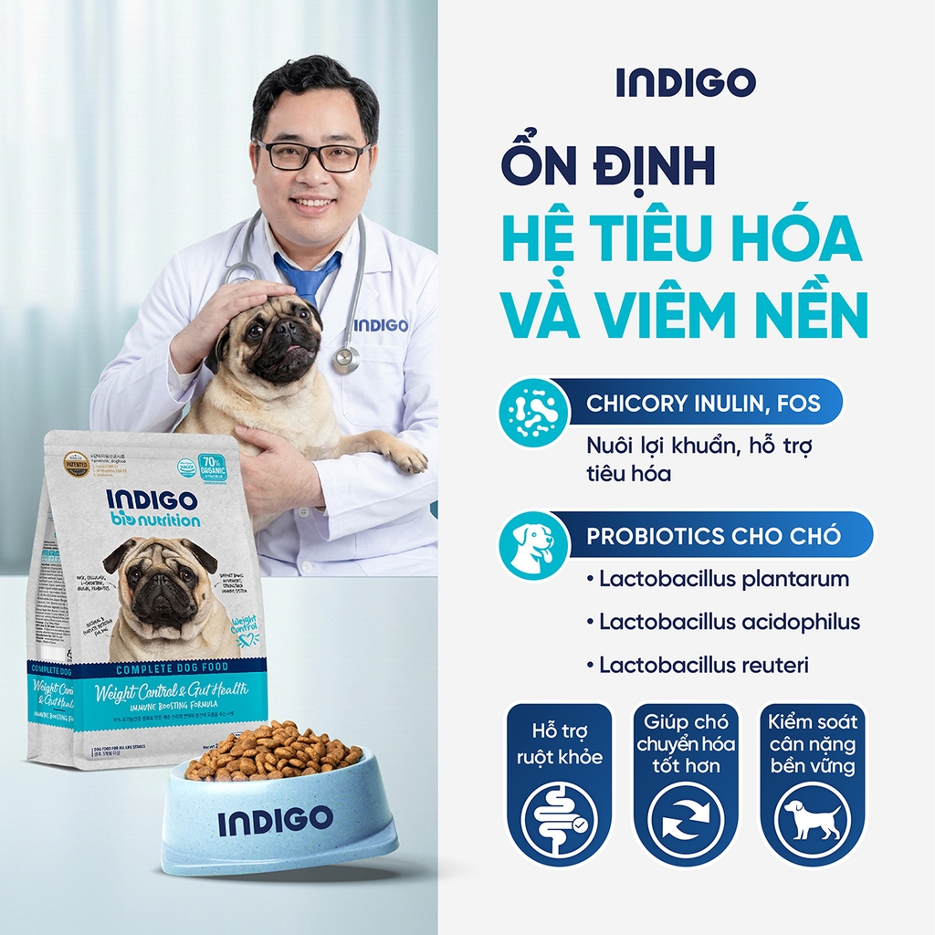 INDIGO Weight & Gut Health phù hợp cho chó trưởng thành, đặc biệt là những chú chó có xu hướng thừa cân, dễ tăng cân hoặc cần kiểm soát cân nặng lâu dài. Sản phẩm thích hợp cho chó ít vận động, chó sau triệt sản hoặc những bé cần chế độ ăn hỗ trợ giảm mỡ nhưng vẫn duy trì thể trạng khỏe mạnh. Đồng thời, công thức còn hỗ trợ hệ tiêu hóa nhạy cảm, giúp cân bằng hệ vi sinh đường ruột và cải thiện khả năng hấp thu dưỡng chất. Đây là giải pháp dinh dưỡng phù hợp để kiểm soát cân nặng, ổn định tiêu hóa và duy trì sức khỏe tổng thể cho chó khi sử dụng lâu dài trong khẩu phần ăn hằng ngày.