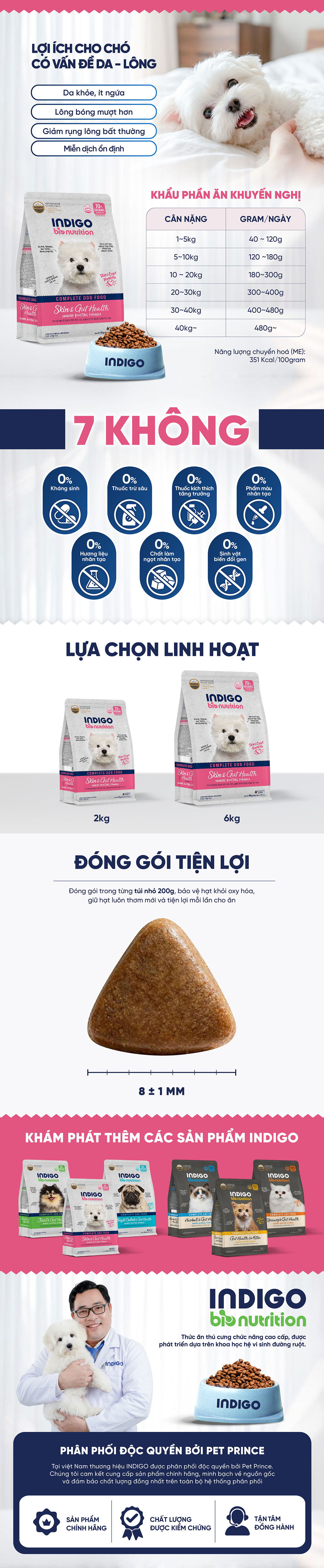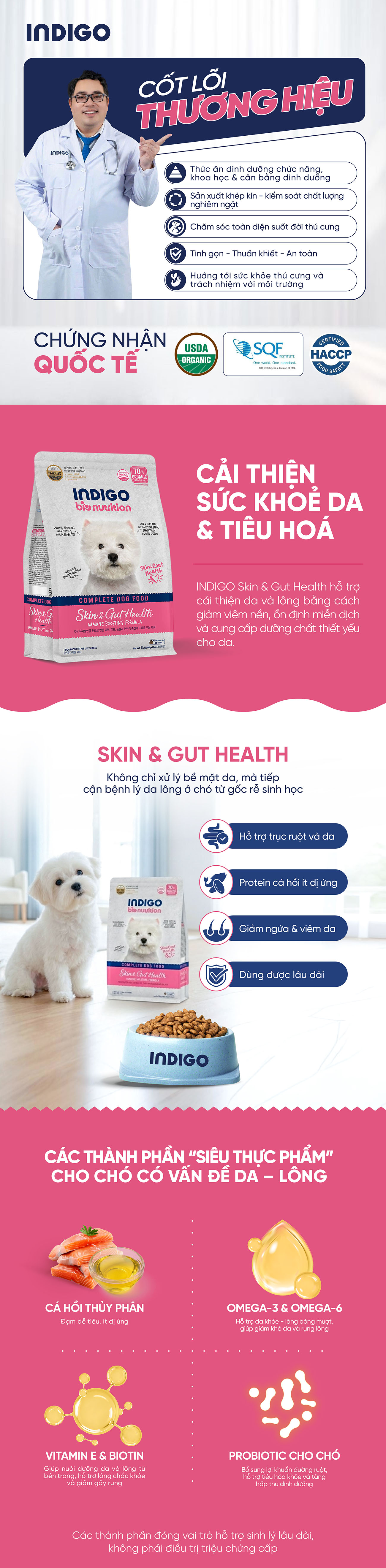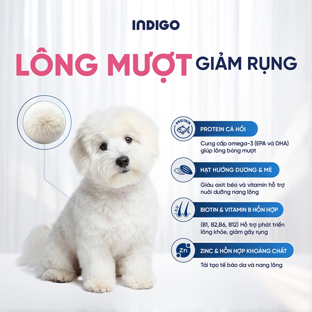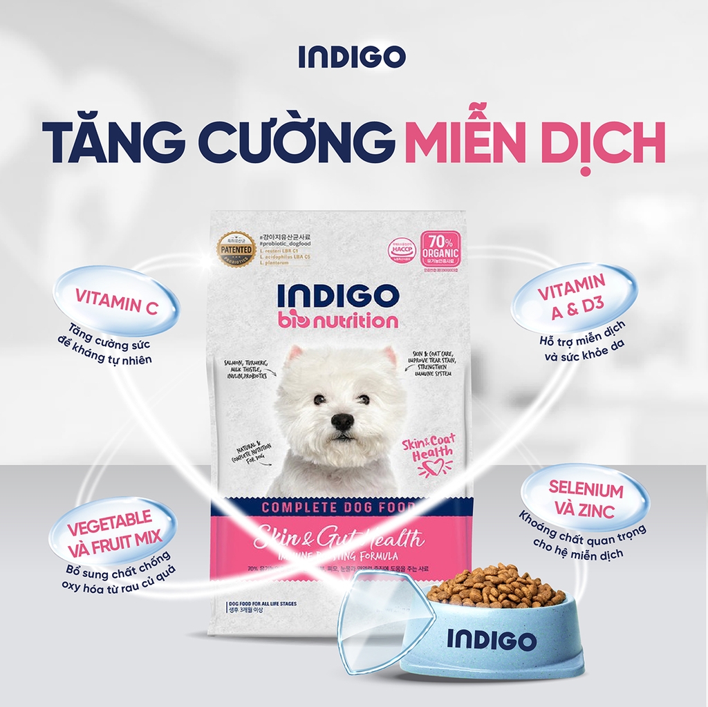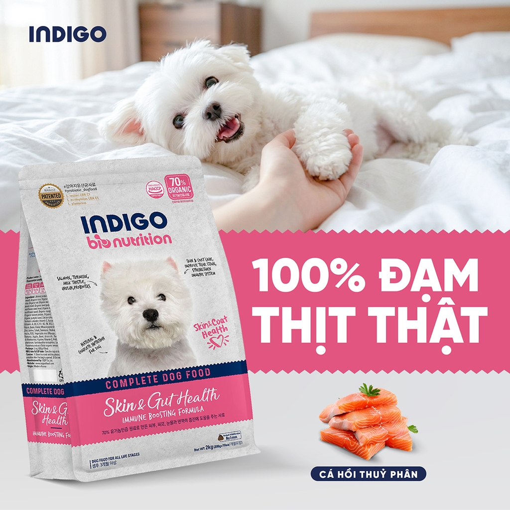 Theo tiêu chuẩn dinh dưỡng của AAFCO/FEDIAF và thực hành thú y, các vấn đề da và lông ở chó thường liên quan đến viêm mạn tính mức độ thấp, rối loạn miễn dịch và mất cân bằng hệ vi sinh đường ruột. Vì vậy, giải pháp dinh dưỡng hiệu quả cần kết hợp protein dễ tiêu, ít gây dị ứng, acid béo thiết yếu như Omega-3 và Omega-6, cùng các vi chất hỗ trợ da và nang lông, đồng thời giúp ổn định trục ruột - da Dựa trên nguyên tắc này, công thức INDIGO Skin & Gut Health được xây dựng nhằm tác động vào nguyên nhân sinh lý của vấn đề da, không chỉ cải thiện biểu hiện bên ngoài mà còn hỗ trợ sức khỏe da và lông từ bên trong.