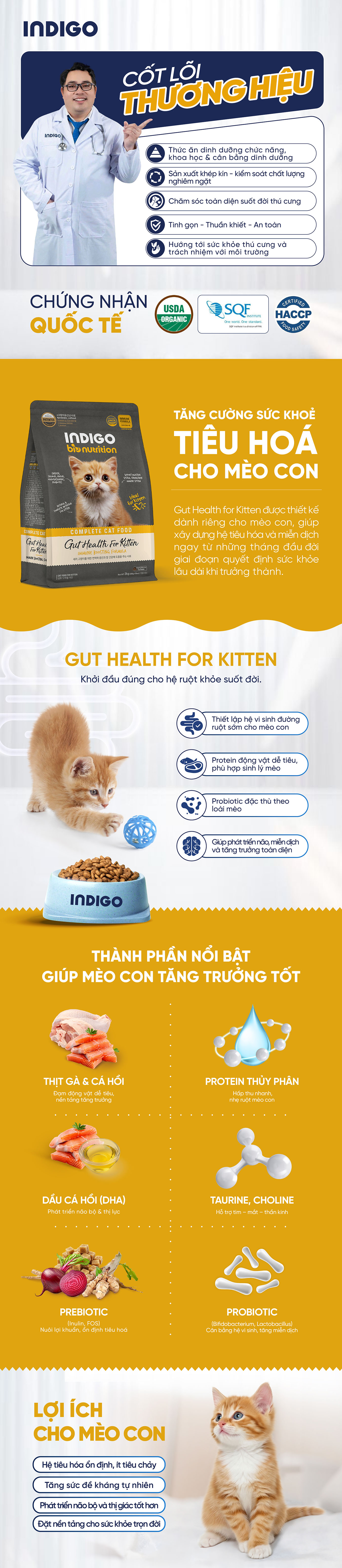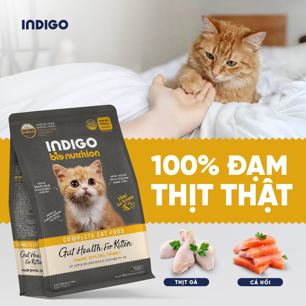 Thức ăn dinh dưỡng chức năng Indigo cho mèo con tăng cường sức khỏe tiêu hóa được xây dựng đúng sinh lý mèo con, không “ăn chay hóa”, không cắt giảm protein động vật để đổi lấy cảm giác nhẹ bụng giả tạo, mà vẫn đảm bảo tiêu hóa dễ dàng nhờ cấu trúc nguyên liệu phù hợp.