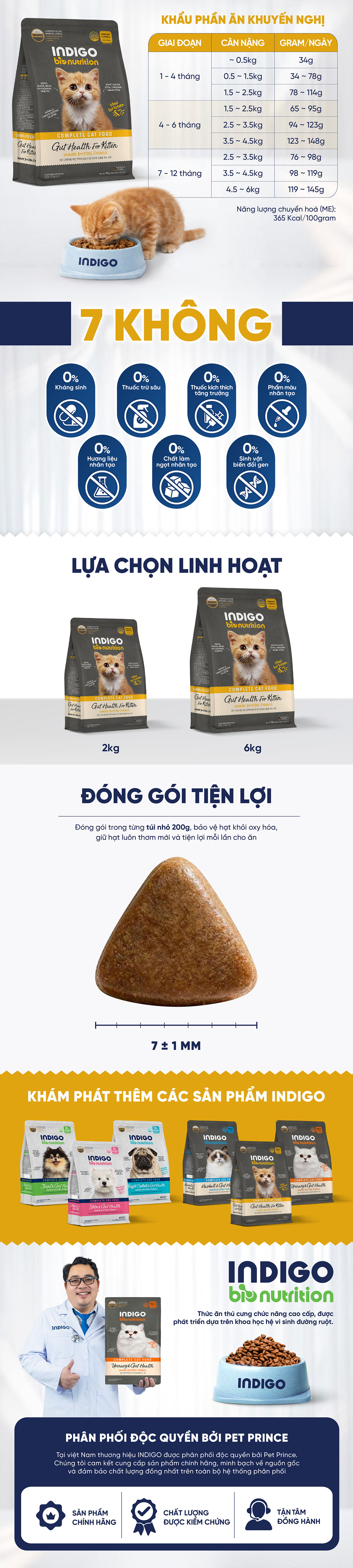 Hơn nữa, dạ dày mèo con rất nhỏ. Nếu ăn thức ăn của mèo lớn, chúng buộc phải ăn một lượng quá nhiều mới đủ chất, dễ dẫn đến quá tải hệ tiêu hóa hoặc còi cọc, chậm lớn do thiếu hụt dinh dưỡng. Thức ăn dinh dưỡng chức năng Indigo cho mèo con tăng cường sức khỏe tiêu hóa được thiết kế cô đặc dinh dưỡng để mèo con chỉ cần ăn lượng vừa đủ vẫn đảm bảo phát triển tối ưu.