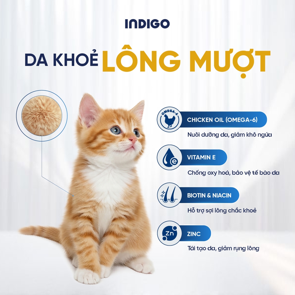 Giai đoạn mèo con phát triển đòi hỏi đầy đủ các vi chất thiết yếu để hỗ trợ tăng trưởng thể chất và hoàn thiện chức năng sinh học. Thức ăn dinh dưỡng chức năng Indigo cho mèo con tăng cường sức khỏe tiêu hóa cung cấp taurine, DL-methionine, L-lysine cùng hệ vitamin và khoáng chất cân đối, đáp ứng nhu cầu phát triển tim mạch, thị lực, miễn dịch và hệ thần kinh. Công thức được tính toán theo chuẩn thú y, giúp mèo con phát triển cân đối, không thiếu hụt cũng không gây dư thừa gây áp lực cơ thể.