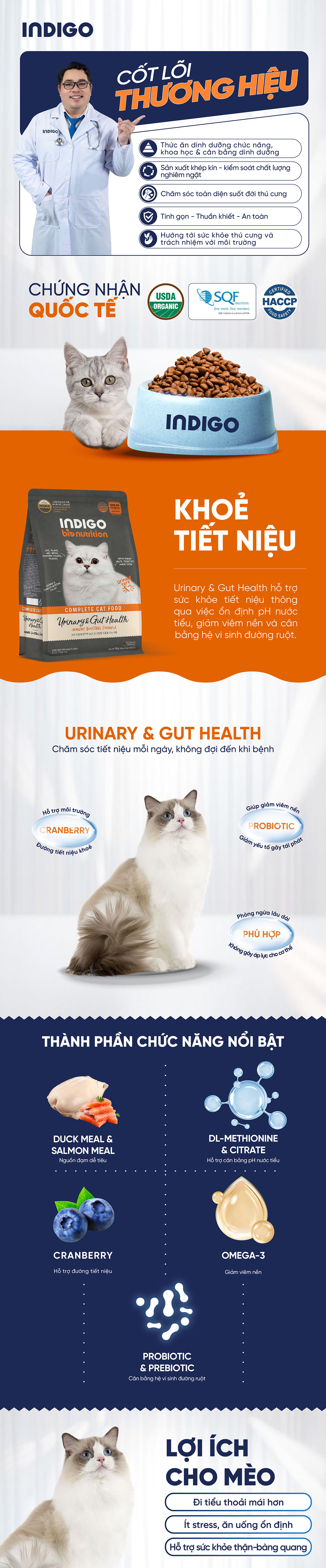 INDIGO là thương hiệu đầu tiên tại Hàn Quốc phát triển thức ăn dinh dưỡng chức năng cho mèo chứa lợi khuẩn được cấp bằng sáng chế. Thức ăn dinh dưỡng chức năng cho mèo tăng cường sức khỏe tiết niệu và tiêu hóa ứng dụng công nghệ men vi sinh độc quyền giúp cân bằng hệ vi sinh đường ruột, giảm rối loạn tiêu hóa và tối ưu hấp thu đạm, vitamin và khoáng chất, từ đó tăng sức đề kháng tự nhiên.