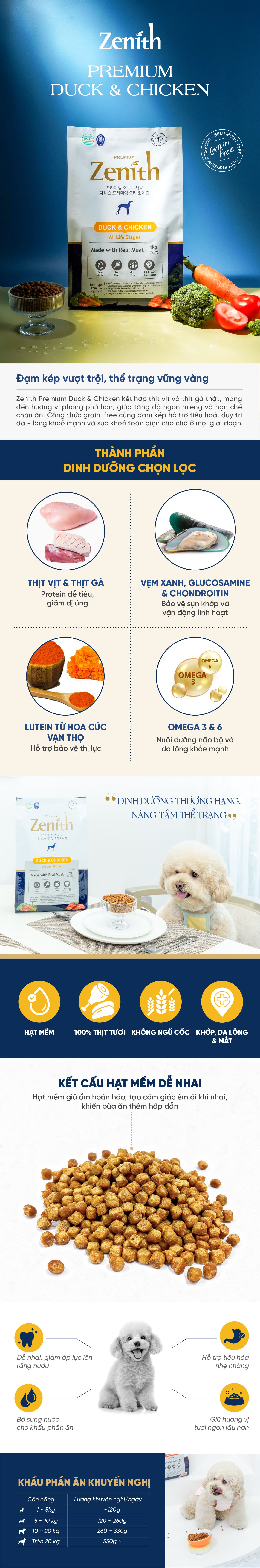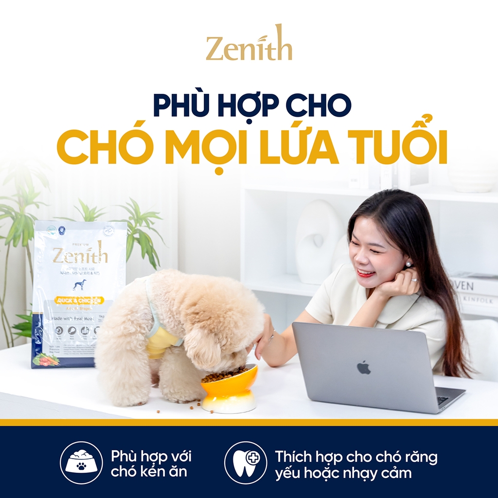 Zenith Premium Duck & Chicken phù hợp với chó ở mọi lứa tuổi và mọi giai đoạn cuộc đời. Sản phẩm đặc biệt thích hợp cho những bé kén ăn hoặc thường xuyên bỏ bữa, chó có răng nhạy cảm hoặc răng yếu và những bé cần bổ sung thêm độ ẩm trong khẩu phần ăn hàng ngày.