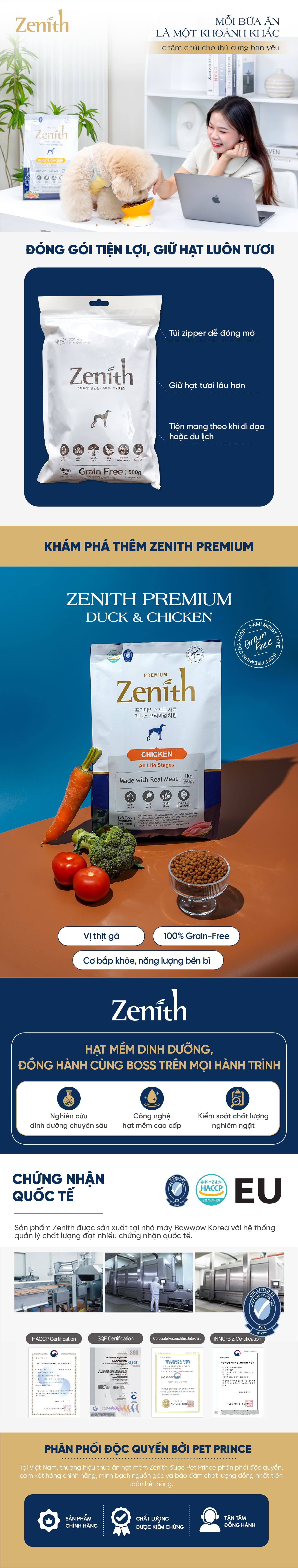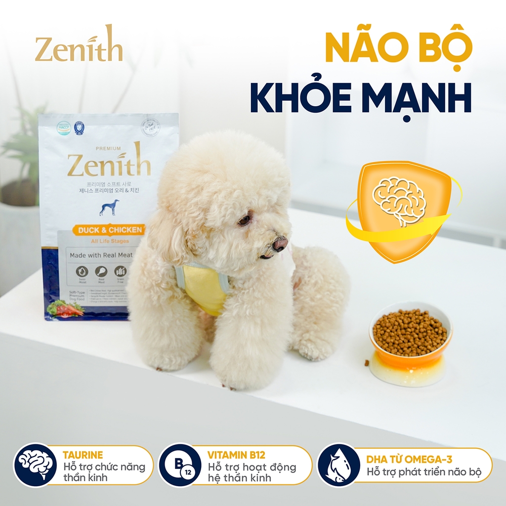 Zenith là thương hiệu thức ăn hạt mềm cao cấp tại Hàn Quốc, được phát triển bởi Bowwow Korea - doanh nghiệp với hơn 20 năm kinh nghiệm trong nghiên cứu và sản xuất dinh dưỡng thú cưng. Với hệ thống R&D chuyên sâu và nhà máy đạt các tiêu chuẩn quốc tế như HACCP, SQF và EU Registration, Zenith mang đến những sản phẩm dinh dưỡng an toàn, chất lượng cao. Thương hiệu hiện đã được tin dùng tại Hàn Quốc và xuất khẩu đến nhiều quốc gia, trở thành lựa chọn đáng tin cậy cho bữa ăn hằng ngày của thú cưng.