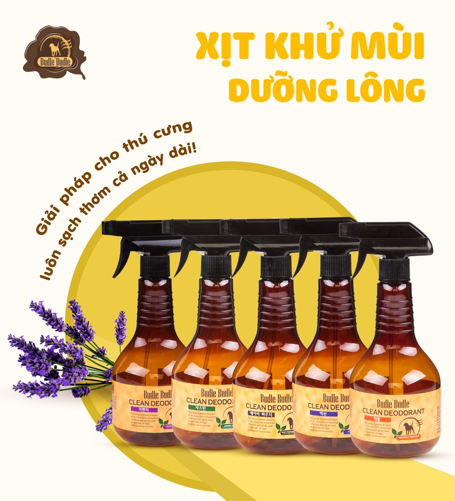 Xịt khử mùi dưỡng lông Budle'Budle an toàn và hiệu quả cho tất cả các giống chó, mang lại sự thoải mái cho thú cưng mỗi ngày.