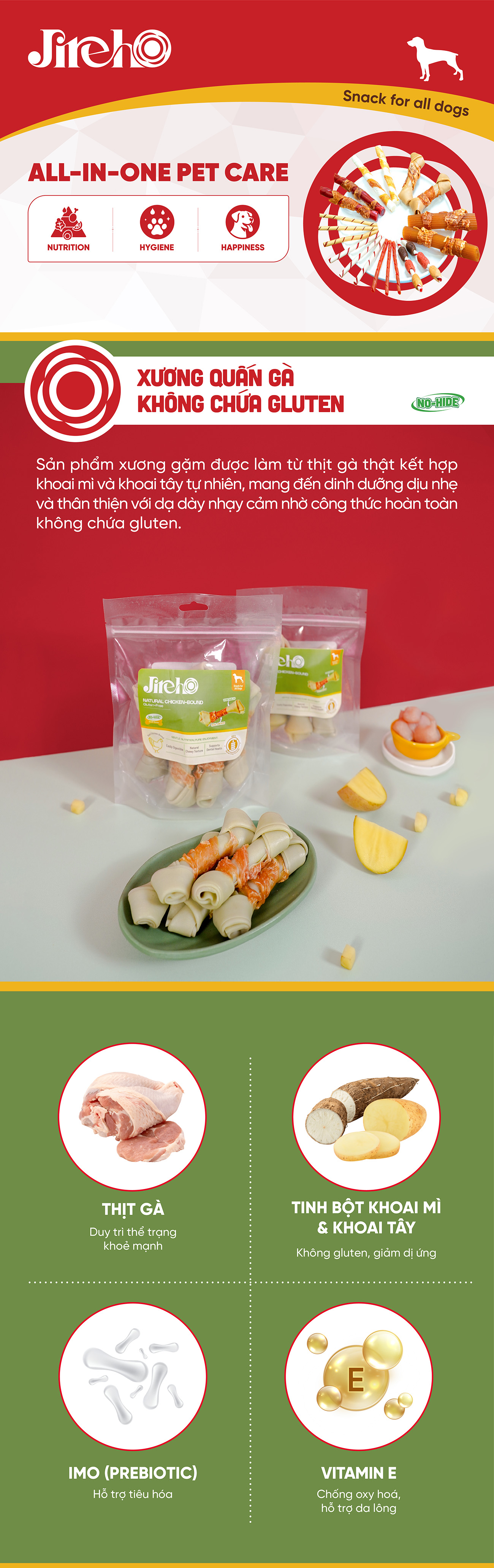 Sản phẩm được làm từ tinh bột khoai mì và bột khoai tây, hoàn toàn không chứa gluten, giúp giảm nguy cơ kích ứng và hỗ trợ tiêu hóa tốt hơn so với các loại snack chứa lúa mì. Công thức này đặc biệt phù hợp với cún cưng có dạ dày nhạy cảm hoặc dễ gặp vấn đề tiêu hóa.
