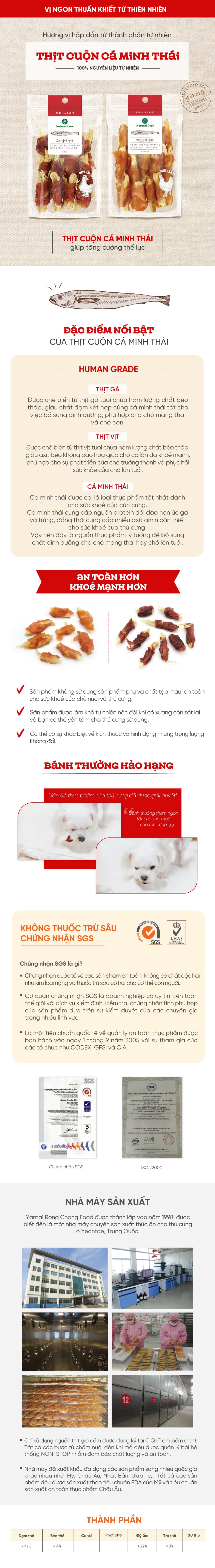 - Thịt vịt cuộn cá minh thái: Vịt, Cá minh thái, Glycerin thực vật (dầu dừa), Muối.