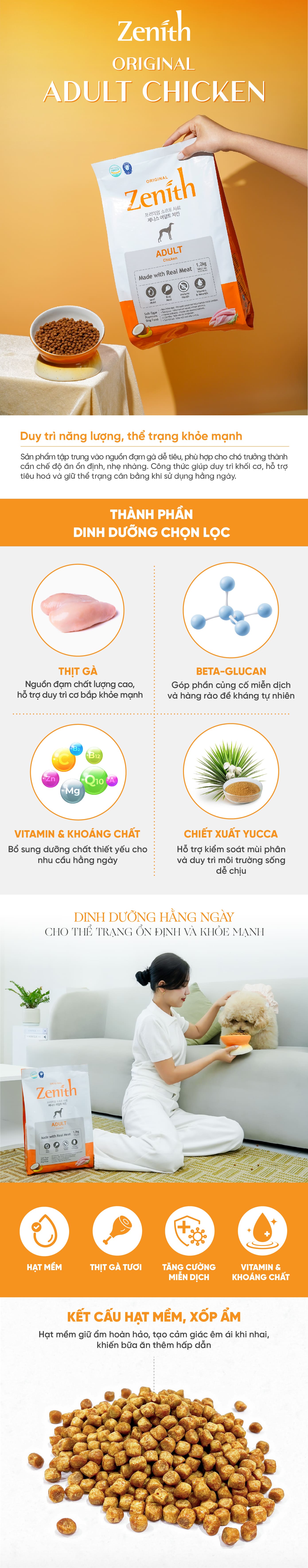 Zenith Original Adult Chicken phù hợp cho chó ở giai đoạn trưởng thành. Sản phẩm đặc biệt thích hợp cho những bé kén ăn hoặc thường xuyên bỏ bữa, chó có răng nhạy cảm hoặc răng yếu và những bé cần bổ sung thêm độ ẩm trong khẩu phần ăn hàng ngày.