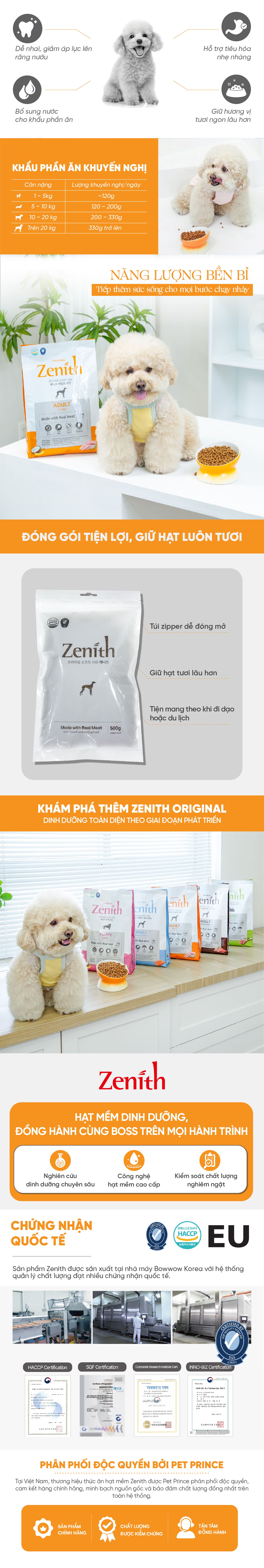 Zenith là thương hiệu thức ăn hạt mềm cao cấp tại Hàn Quốc, được phát triển bởi Bowwow Korea - doanh nghiệp với hơn 20 năm kinh nghiệm trong nghiên cứu và sản xuất dinh dưỡng thú cưng. Với hệ thống R&D chuyên sâu và nhà máy đạt các tiêu chuẩn quốc tế như HACCP, SQF và EU Registration, Zenith mang đến những sản phẩm dinh dưỡng an toàn, chất lượng cao. Thương hiệu hiện đã được tin dùng tại Hàn Quốc và xuất khẩu đến nhiều quốc gia, trở thành lựa chọn đáng tin cậy cho bữa ăn hằng ngày của thú cưng.